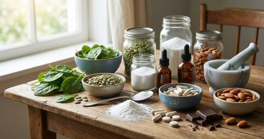 Ano, hořčík a vápník se vzájemně podporují při ukládání do kostní hmoty a svalové kontrakci. Dodržujte poměr 1:2 (hořčík:vápník) nebo 2:1 ve prospěch hořčíku při stresu a křečích. Nikdy neužívejte oba minerály současně v jednom okamžiku – rozdělte příjem mezi snídani a večeři pro maximální absorpci.